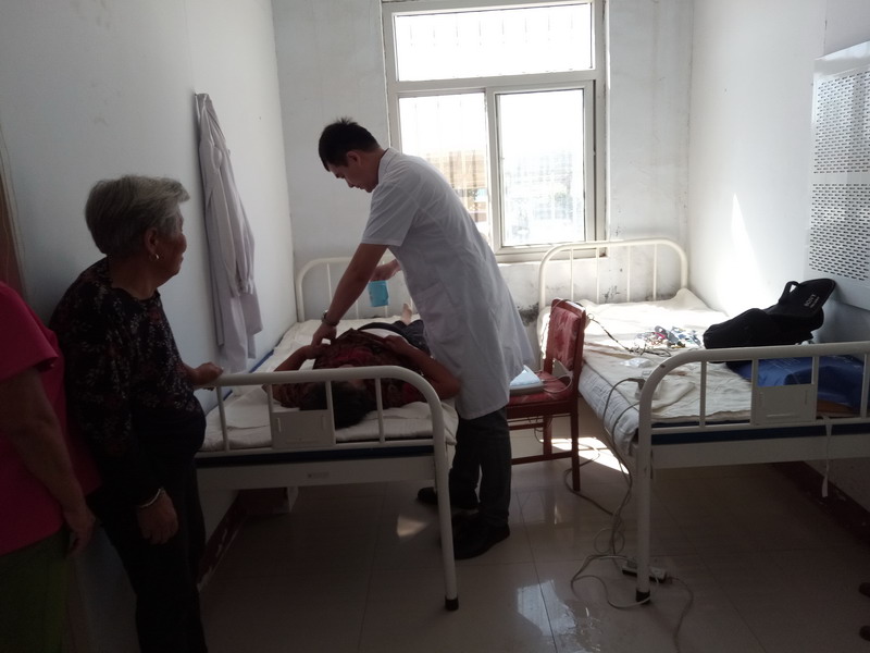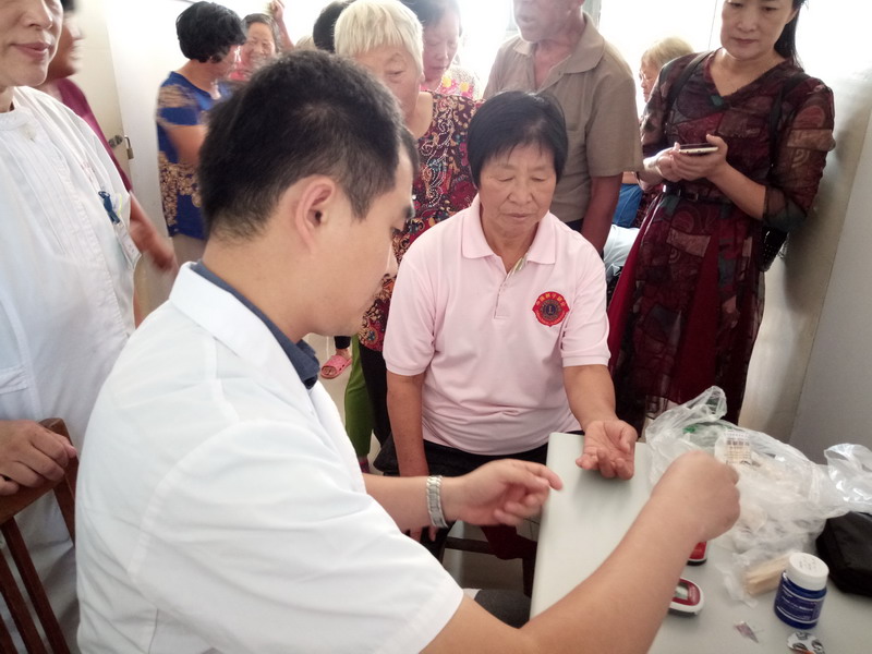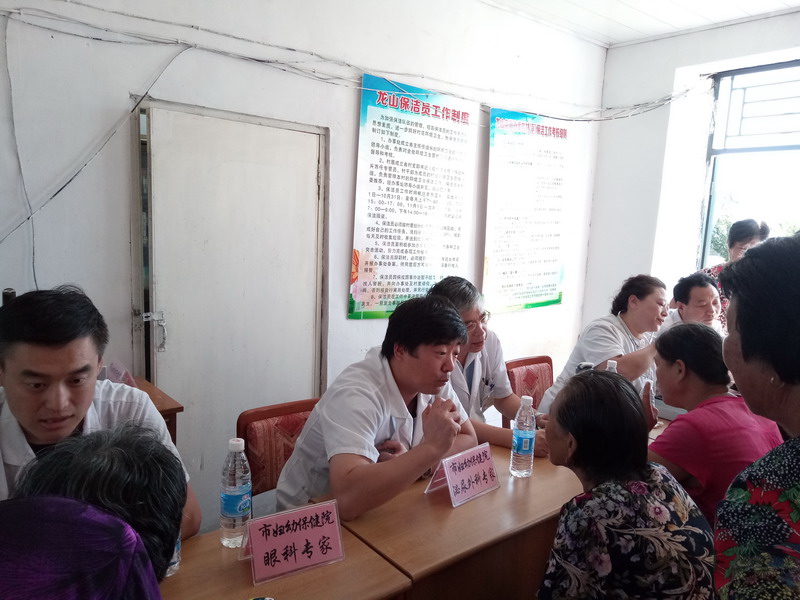 早上7:30分从威海出发,经过一个半小时路途颠簸,上午9点到达村里。到村后专家们没有顾得上休息,换上白大褂,简短布置了一下场地就立即投入到义诊中。村委办公室虽然条件简单,就诊不方便,但各位专家态度认真,语气和蔼,发挥专家优势,各施所长,逐一接待前来问诊的村民,消化内科孙主任、普外科郭主任、泌尿外科孙主任、眼科孙主任在临时摆放的桌子前不厌其烦解答村民的咨询,化解村民对身体不适症状的疑惑,李虹科长和邓金虎医师在临时设置的另一房间为排队等候多时的村民测血糖、做心电图,并将测量结果耐心告知每一位村民。从上午9点开始一直到11半,大夫们一直未能休息,即使上洗手间,也是一溜小跑。尽管村民很自觉地排队,但村委会议室空间小,里三层外三层,围得水泄不通,屋里没有风扇,加上天气闷热,汗水湿透了大夫们的衣服。参加义诊村民既有90岁高龄的老人,还有牙牙学语的婴儿,在2个多小时时间里,共计为102名村民进行了免费检查、诊断。义诊活动结束后村民们高兴地说:“感谢这些大医院的大夫,我们不出家门,就能看上病,让大夫们看看、检查一下,有病没病心里都踏实了,上门来为我们老百姓免费检查,真是感谢现在的好政策呀”
