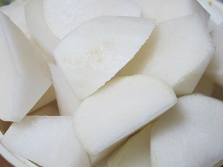 步骤4:萝卜洗净、去皮,滚刀切成块状。