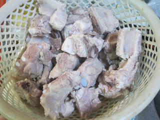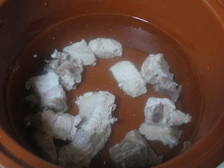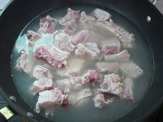 步骤1:排骨斩成1寸左右的段,冷水下锅焯水(锅中的水里加入1大勺料酒)。