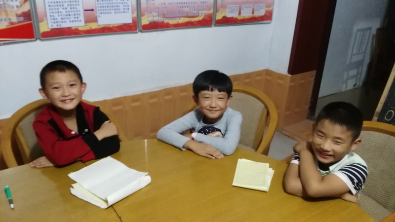 记得在8月8日,正式上课的那天晚上,那会是5个人,鞠官正、战明辉、郝玲玉、曲明浩、战宇新,我让每个人在黑板上写下自己的名字,随后,先给他们讲学习英语的好处和意义,仍记得他们脸上那似懂非懂的表情,也是会把人逗笑的!从字母、到简单的单词、对话,每个人都很用心的识记,有的甚至上完课回家继续背,背不上还不睡觉了!课堂上,大家也都非常的勇跃,时不时地还会传来窃窃私语、轻声的提示音以及爽朗的笑声,让我深切地感受到了孩子们的天真与可爱,所以,给孩子们上课的这些日子,我也被他们这股快乐劲感染了,很开心、很感激,让我的生活也变得充满活力!在课程快结束的时候,孩子们的家长也过来旁听,可以看出来,孩子们都是想极力表现出自己最好的一面!可惜的是,鞠官正和战宇新,一个提前回爸妈家、一个提前请假不上了,最后,只给剩下的三个合了个影!