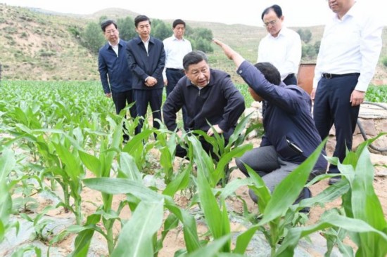 习近平走进赵家洼村的一片农田,察看玉米和芸豆长势。村支书告诉总书记,因为干旱,庄稼植株矮小,产量很低,村民们靠天吃饭。总书记向村民了解了地膜的保墒作用。总书记来到村里唯一的一口饮水井旁,登上用石块垒起的井台,仔细察看井里蓄水的情况。